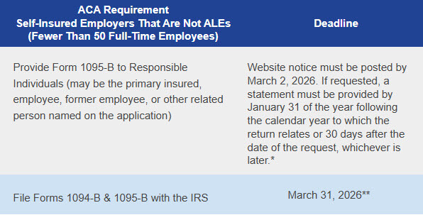 **Reporting entities that do not wish to take advantage of the automatic furnishing method via their websites can provide Forms 1095 to full-time employees/responsible individuals by March 2, 2026. Also, reporting entities should continue to comply with applicable state reporting requirements, which may differ from federal obligations.