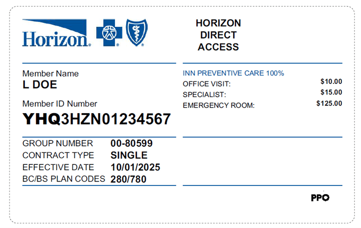 Horizon is in the process of removing the “suitcase” logo from member ID cards for all market segments. The suitcase logo is being replaced with the applicable product indicator (e.g., PPO, HMO, POS — see sample member ID card below).