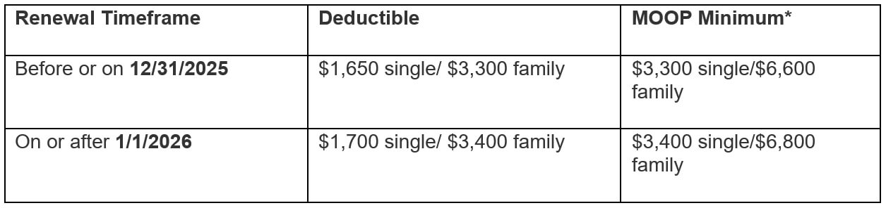 New groups enrolling in an HDHP on or after January 1, 2026 will have the same updated deductibles and MOOPs.